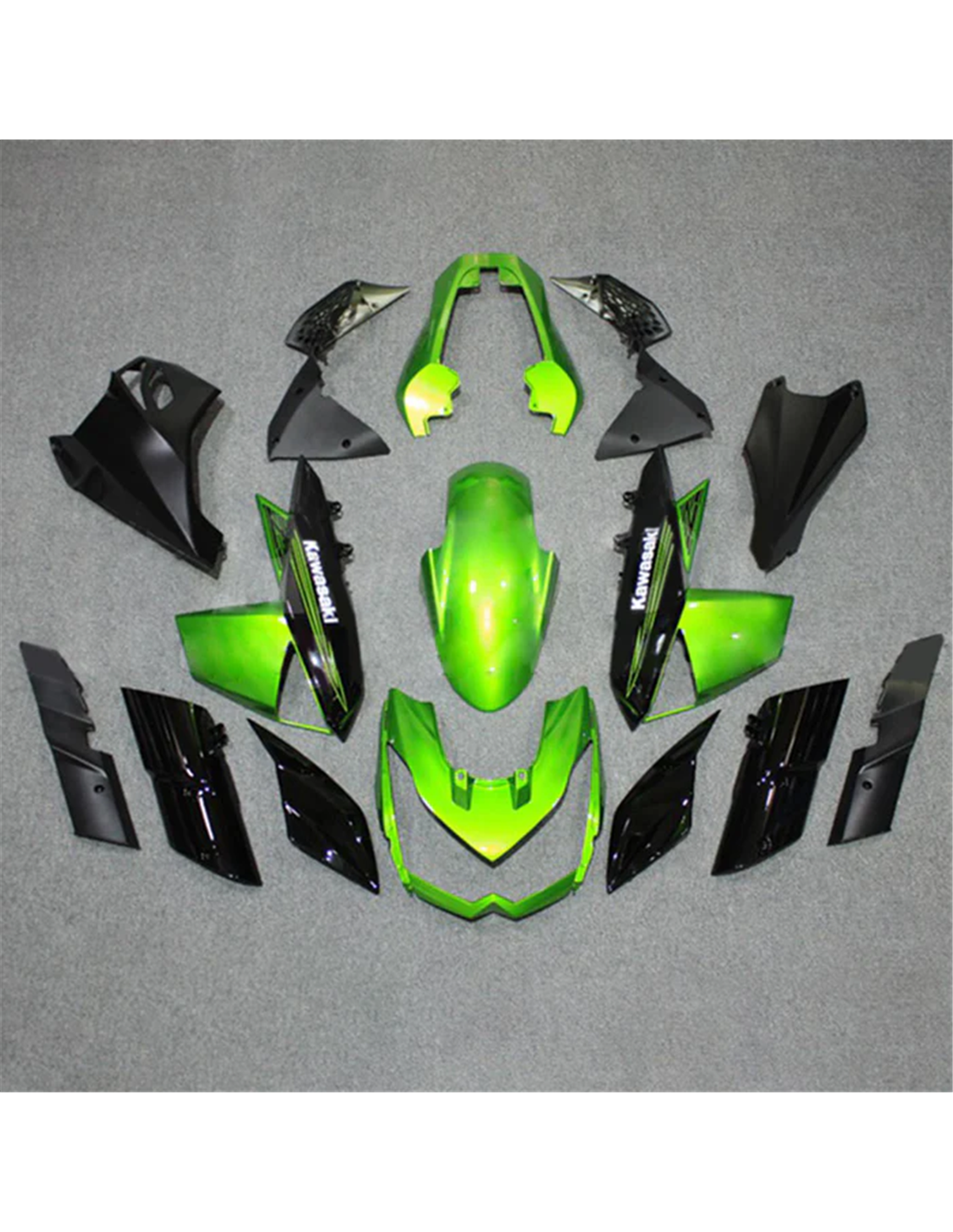 The fairing kit includes: front upper part, side fairings right and left, lower fairing right and left, back seat, front fender and all eventual internal black plastics.