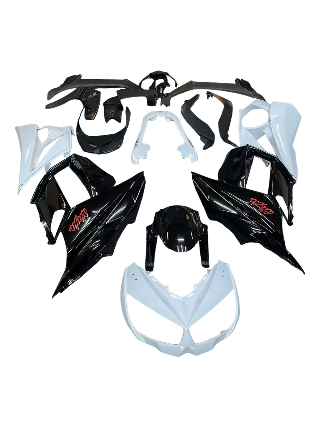 The fairing kit includes: front upper part, side fairings right and left, lower fairing right and left, back seat, front fender and all eventual internal black plastics.