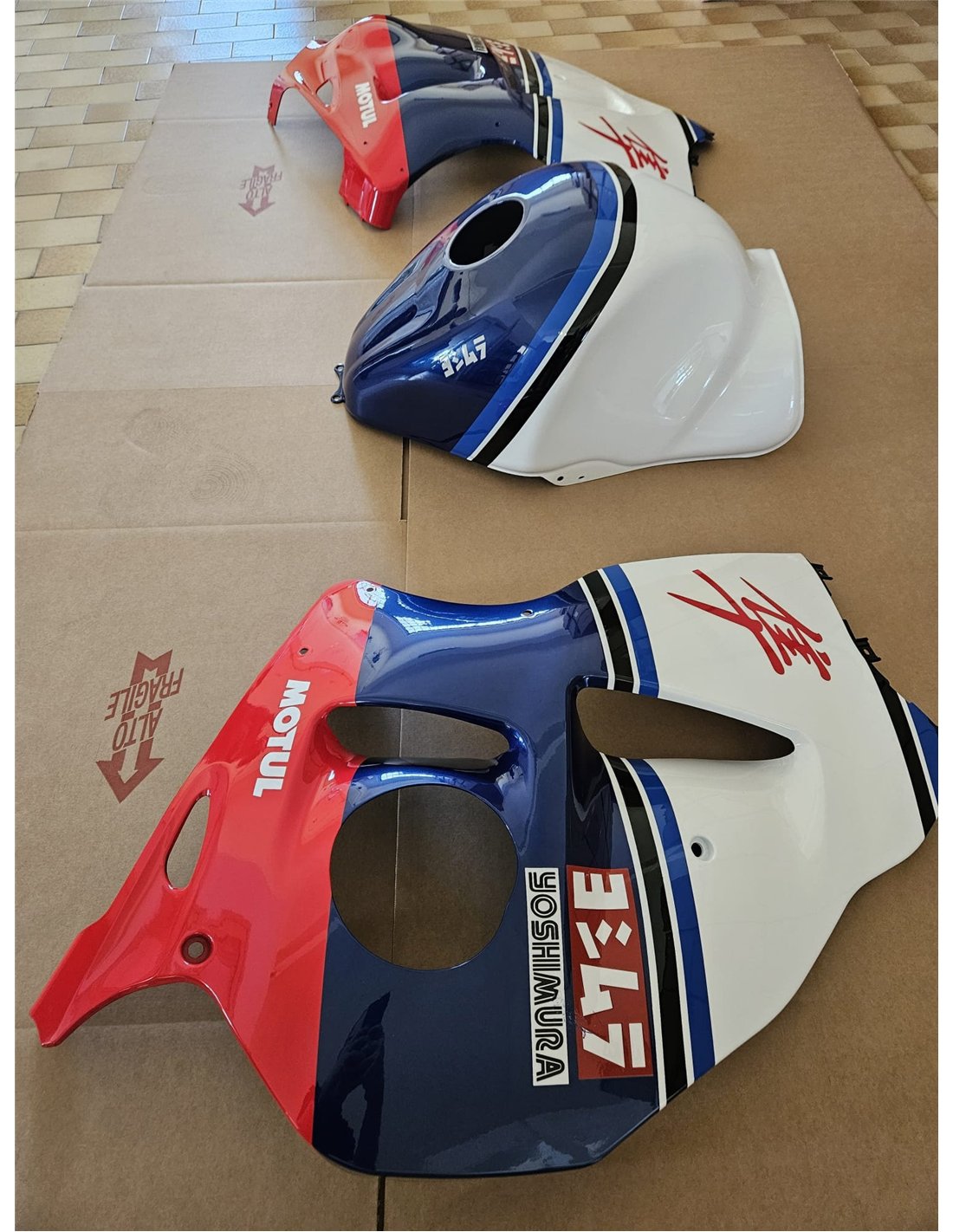 The fairing kit includes: front upper part, side fairings right and left, lower fairing right and left, back seat, front fender and all eventual internal black plastics.