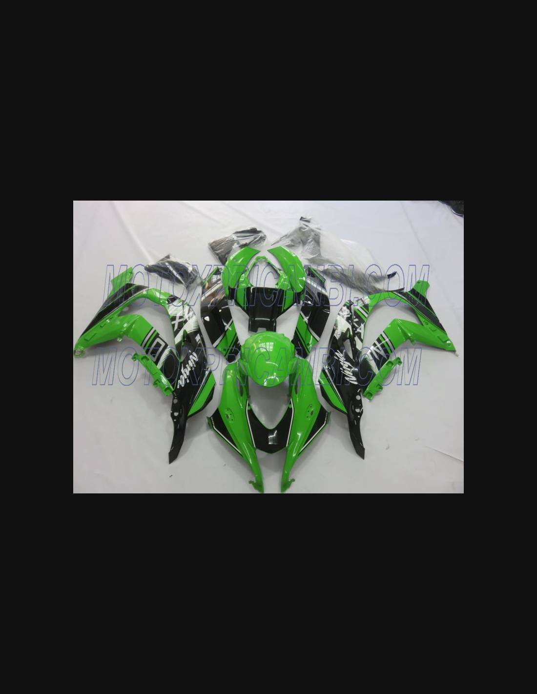 The fairing kit includes: front upper part, side fairings right and left, lower fairing right and left, back seat, front fender and all eventual internal black plastics.
