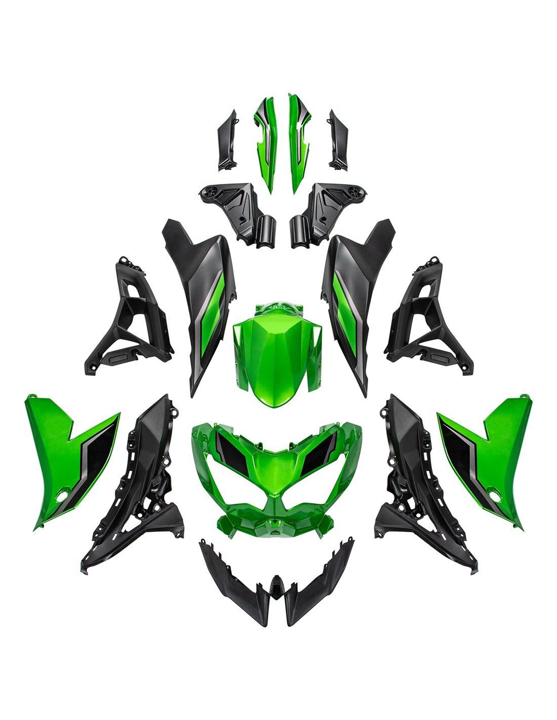 The fairing kit includes: front upper part, side fairings right and left, lower fairing right and left, back seat, front fender and all eventual internal black plastics.