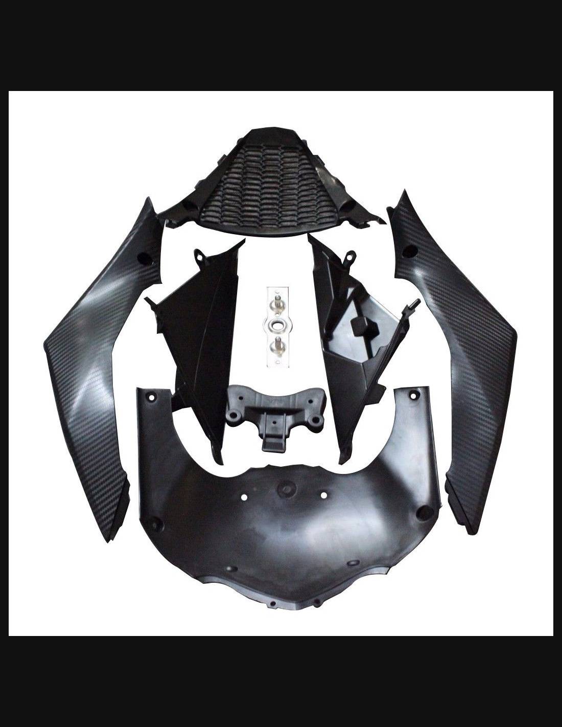 The fairing kit includes: front upper part, side fairings right and left, lower fairing right and left, back seat, front fender and all eventual internal black plastics.