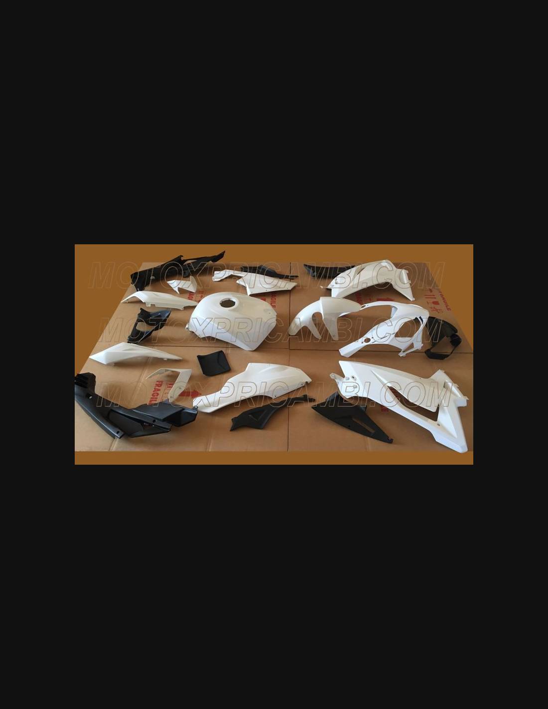 The fairing kit includes: front upper part, side fairings right and left, lower fairing right and left, back seat, front fender, tank cover and all eventual internal black plastics.