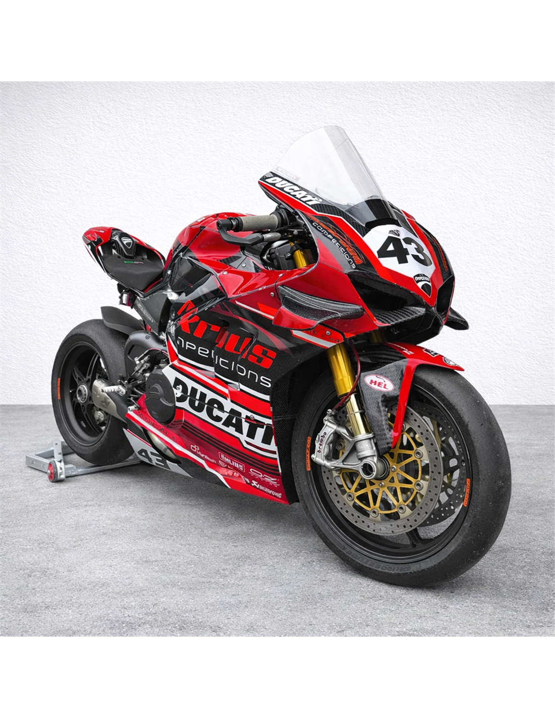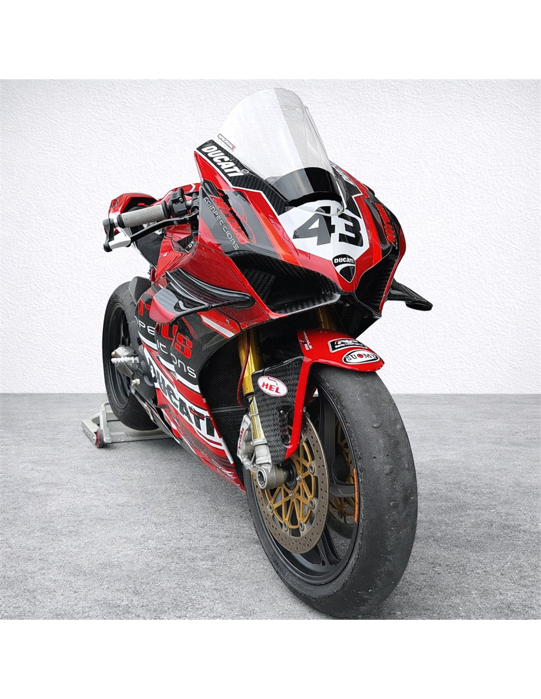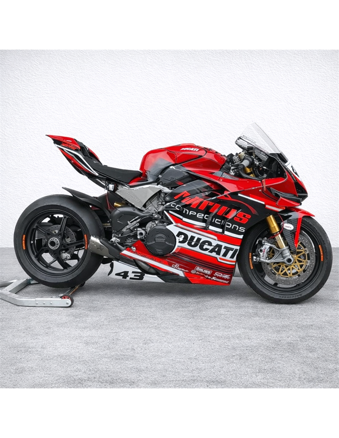 Elite: we use compatible colours with the stock tank of the motorcycle (e.g. Ducati’s red). The stickers are printed using 8-color printers which give them impeccable shine and shades. The whole graphic is under three layers of clear coat to keep the colors of the bodywork bright over time. We also paint the whole fairing kit inside.