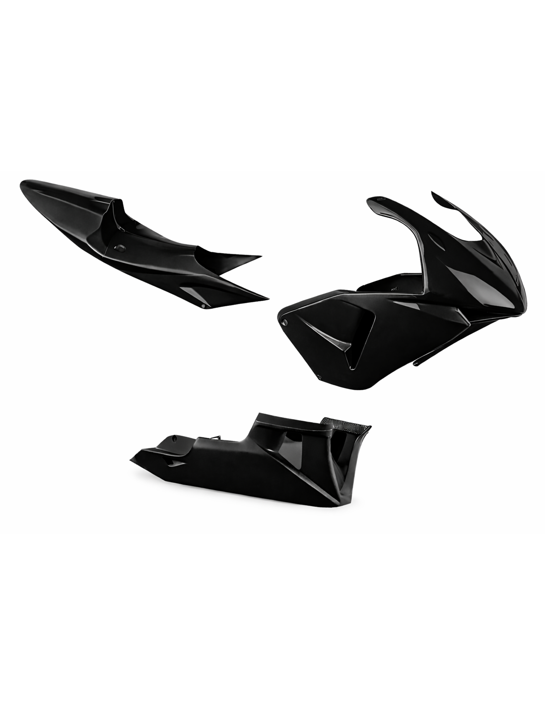 The fairing kit includes: front upper part, right and left side fairings, closed lower fairing approved for the track, tail fairing (the tank cover is not included in the price).