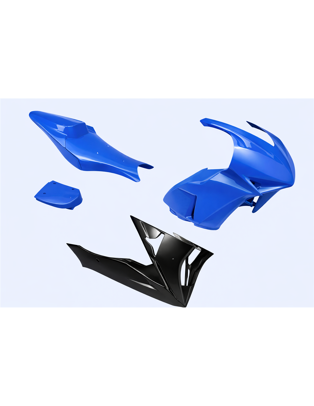 The fairing kit includes: front upper part, side fairings right and left, lower fairing, back seat (the tank cover is not included in the price).