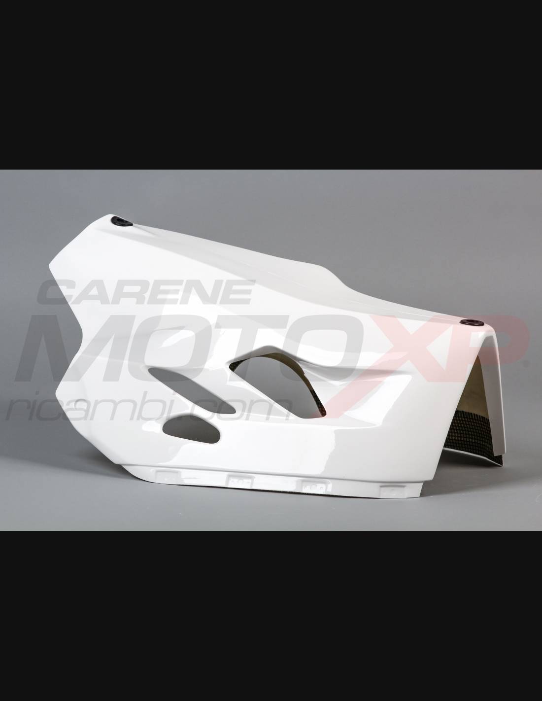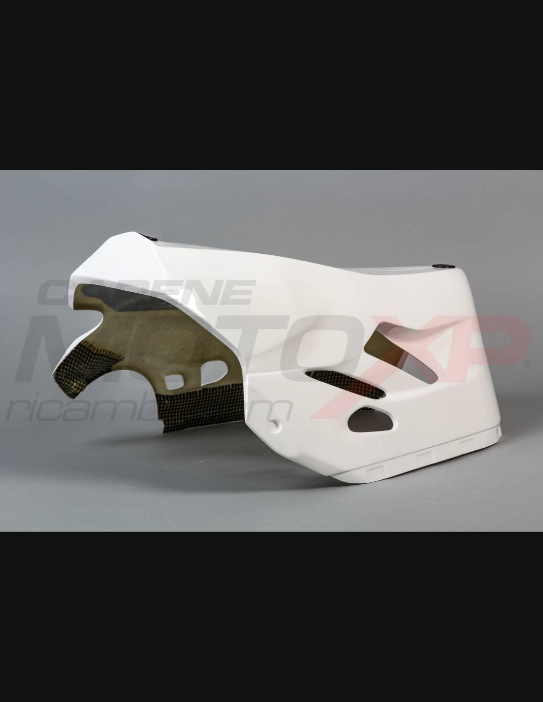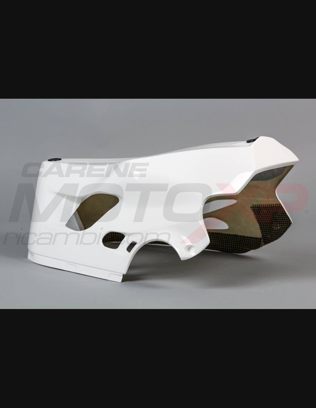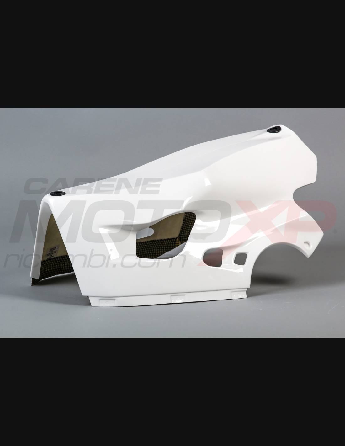 Our race fairings are made of fiberglass, they are reinforced in carbon and Kevlar in the stress areas. We include a closed lower fairing that allows to catch the liquids, so our fairings are approved for the various championships and for the amateur usage on the tracks. We mark where you should drill the holes, so you can make the hole according to the dimension of the screw you are going to use.