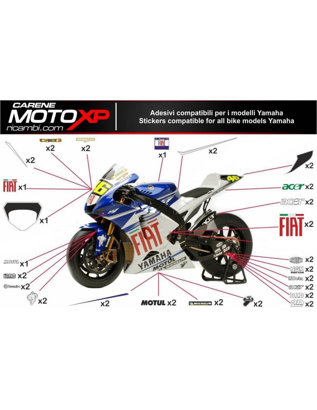 Stickers are produced with high quality materials and are adapted on the dimensions of the bike that the customer indicates during the purchase. The kit includes all non-original stickers, in order to complete the desired design: for front upper part, right and left side fairing, belly pan, back seat, swingarm and front fender. It’s possible to customize stickers too (colours, numbers, names, etc). It’s important to write changes in the field “more information”. The price of the sticker kit doesn’t change, unless substantial modifications (e.g. fluorescent colours). Through the purchase, you accept the sales conditions. You can stick them under the clear coat or after it. Unless a different request of the customer, we will supply the sticker kit with the protection.