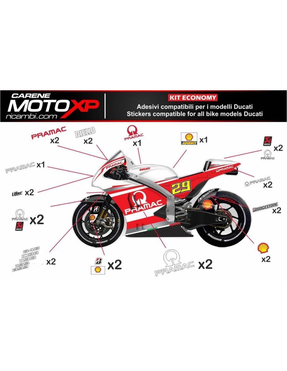 Stickers are produced with high quality materials and are adapted on the dimensions of the bike that the customer indicates during the purchase. The kit includes all non-original stickers, in order to complete the desired design: for front upper part, right and left side fairing, belly pan, back seat, swingarm and front fender. It’s possible to customize stickers too (colours, numbers, names, etc). It’s important to write changes in the field “more information”. The price of the sticker kit doesn’t change, unless substantial modifications (e.g. fluorescent colours). Through the purchase, you accept the sales conditions. You can stick them under the clear coat or after it. Unless a different request of the customer, we will supply the sticker kit with the protection.