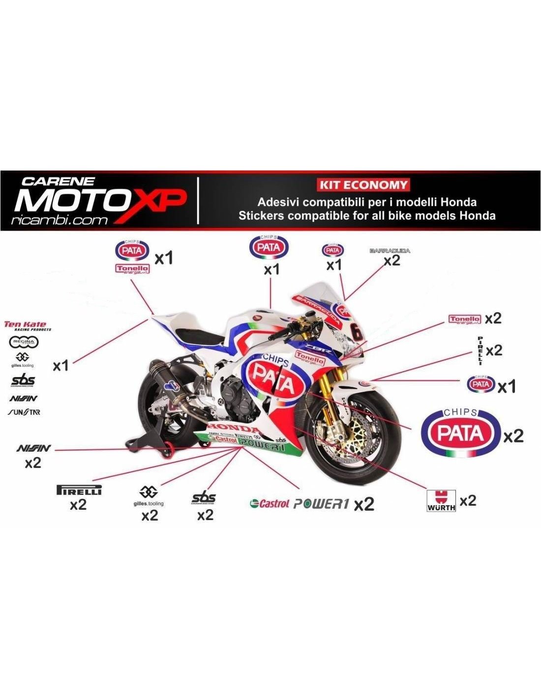 Stickers are produced with high quality materials and are adapted on the dimensions of the bike that the customer indicates during the purchase. The kit includes all non-original stickers, in order to complete the desired design: for front upper part, right and left side fairing, belly pan, back seat, swingarm and front fender. It’s possible to customize stickers too (colours, numbers, names, etc). It’s important to write changes in the field “more information”. The price of the sticker kit doesn’t change, unless substantial modifications (e.g. fluorescent colours). Through the purchase, you accept the sales conditions. You can stick them under the clear coat or after it. Unless a different request of the customer, we will supply the sticker kit with the protection.