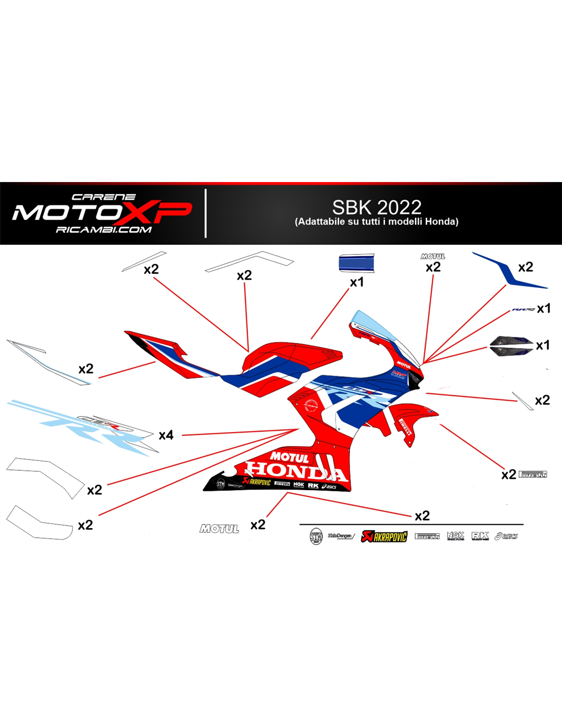 Stickers are produced with high quality materials and are adapted on the dimensions of the bike that the customer indicates during the purchase. The kit includes all non-original stickers, in order to complete the desired design: for front upper part, right and left side fairing, belly pan, back seat, swingarm and front fender. It’s possible to customize stickers too (colours, numbers, names, etc). It’s important to write changes in the field “more information”. The price of the sticker kit doesn’t change, unless substantial modifications (e.g. fluorescent colours). Through the purchase, you accept the sales conditions. You can stick them under the clear coat or after it. Unless a different request of the customer, we will supply the sticker kit with the protection.