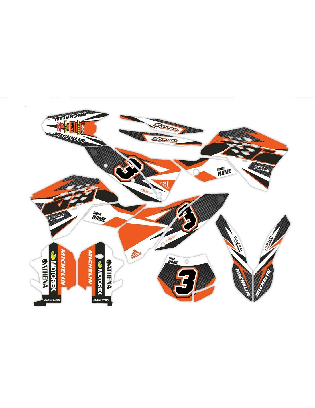 The stickers we produce are made of first quality crystal materials that will be adapted easily and perfectly on the plastics of the motorcycle of the customer. The resistance of the material allows our graphic to stay perfectly sticked also during the most difficult usage conditions of the motorcycle. The installation, thanks to the channels for air discharge lets you install the stickers smoothly and without bubbles. We use last generation machineries for the printing, so we can print bright colors and high qualities shades. We include a protective layer on the stickers, so they will be always bright during the years and are protected against water and dirt. It is possible to customize the stickers as you prefer. You can add, remove or change technician sponsors, add a custom race number or your own name. You can indicate all changes in the field “Product customization” on the website during the purchase. We are not limited only to the graphics on our website, you can send us by email or WhatsApp a picture of a design we don’t have, so we can make you a quotation and then make it. Through the purchase, you accept the sales conditions.