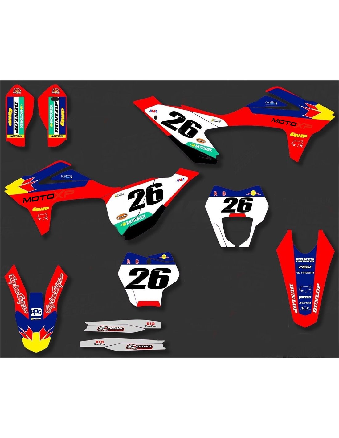 The stickers we produce are made of first quality crystal materials that will be adapted easily and perfectly on the plastics of the motorcycle of the customer. The resistance of the material allows our graphic to stay perfectly sticked also during the most difficult usage conditions of the motorcycle. The installation, thanks to the channels for air discharge lets you install the stickers smoothly and without bubbles. We use last generation machineries for the printing, so we can print bright colors and high qualities shades. We include a protective layer on the stickers, so they will be always bright during the years and are protected against water and dirt. It is possible to customize the stickers as you prefer. You can add, remove or change technician sponsors, add a custom race number or your own name. You can indicate all changes in the field “Product customization” on the website during the purchase. We are not limited only to the graphics on our website, you can send us by email or WhatsApp a picture of a design we don’t have, so we can make you a quotation and then make it. Through the purchase, you accept the sales conditions.