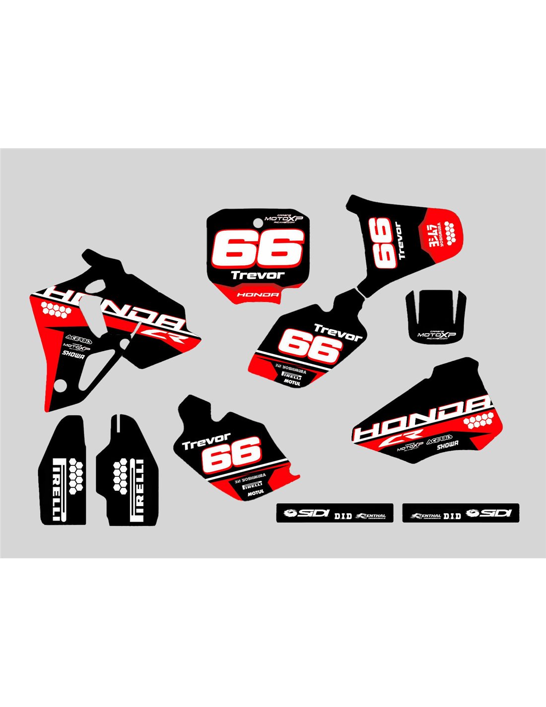The stickers we produce are made of first quality crystal materials that will be adapted easily and perfectly on the plastics of the motorcycle of the customer. The resistance of the material allows our graphic to stay perfectly sticked also during the most difficult usage conditions of the motorcycle. The installation, thanks to the channels for air discharge lets you install the stickers smoothly and without bubbles. We use last generation machineries for the printing, so we can print bright colors and high qualities shades. We include a protective layer on the stickers, so they will be always bright during the years and are protected against water and dirt. It is possible to customize the stickers as you prefer. You can add, remove or change technician sponsors, add a custom race number or your own name. You can indicate all changes in the field “Product customization” on the website during the purchase. We are not limited only to the graphics on our website, you can send us by email or WhatsApp a picture of a design we don’t have, so we can make you a quotation and then make it. Through the purchase, you accept the sales conditions.